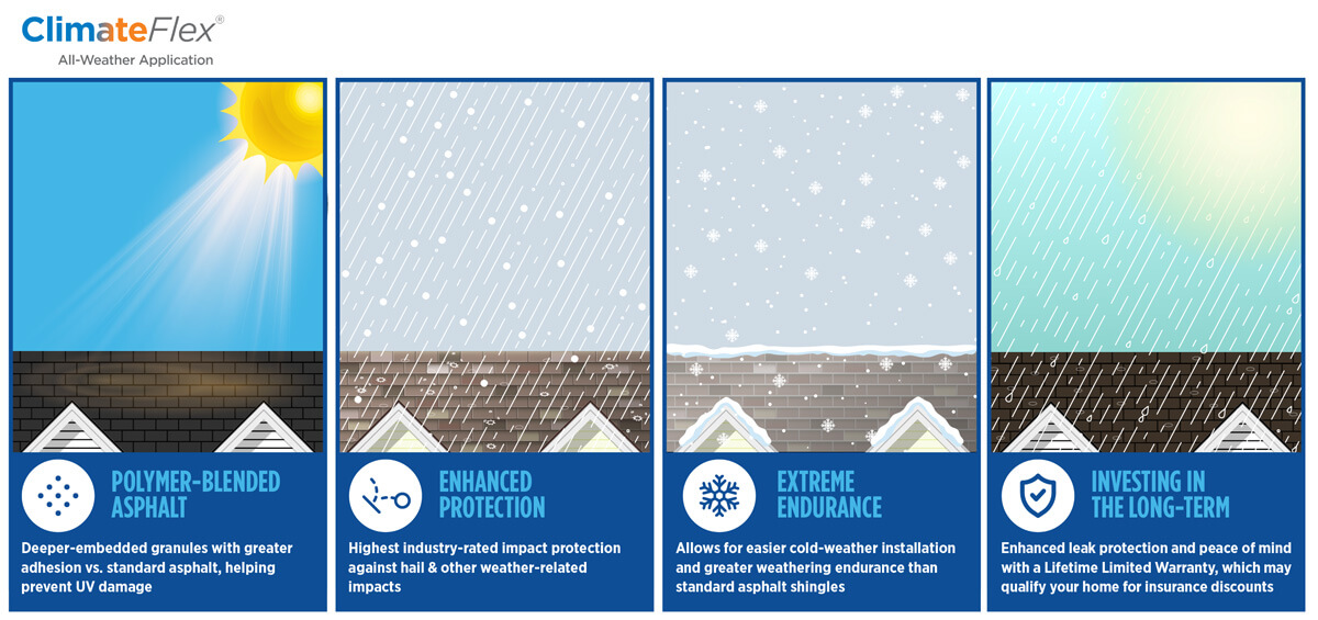 When severe weather hits, your roof matters most. That’s why, as CertainTeed Certified Roofing Specialists, we install Landmark® ClimateFlex® shingles—designed to flex on impact and help reduce damage from hail and debris. With added algae resistance and dependable performance, they’re a smart choice for long-term protection in our region.