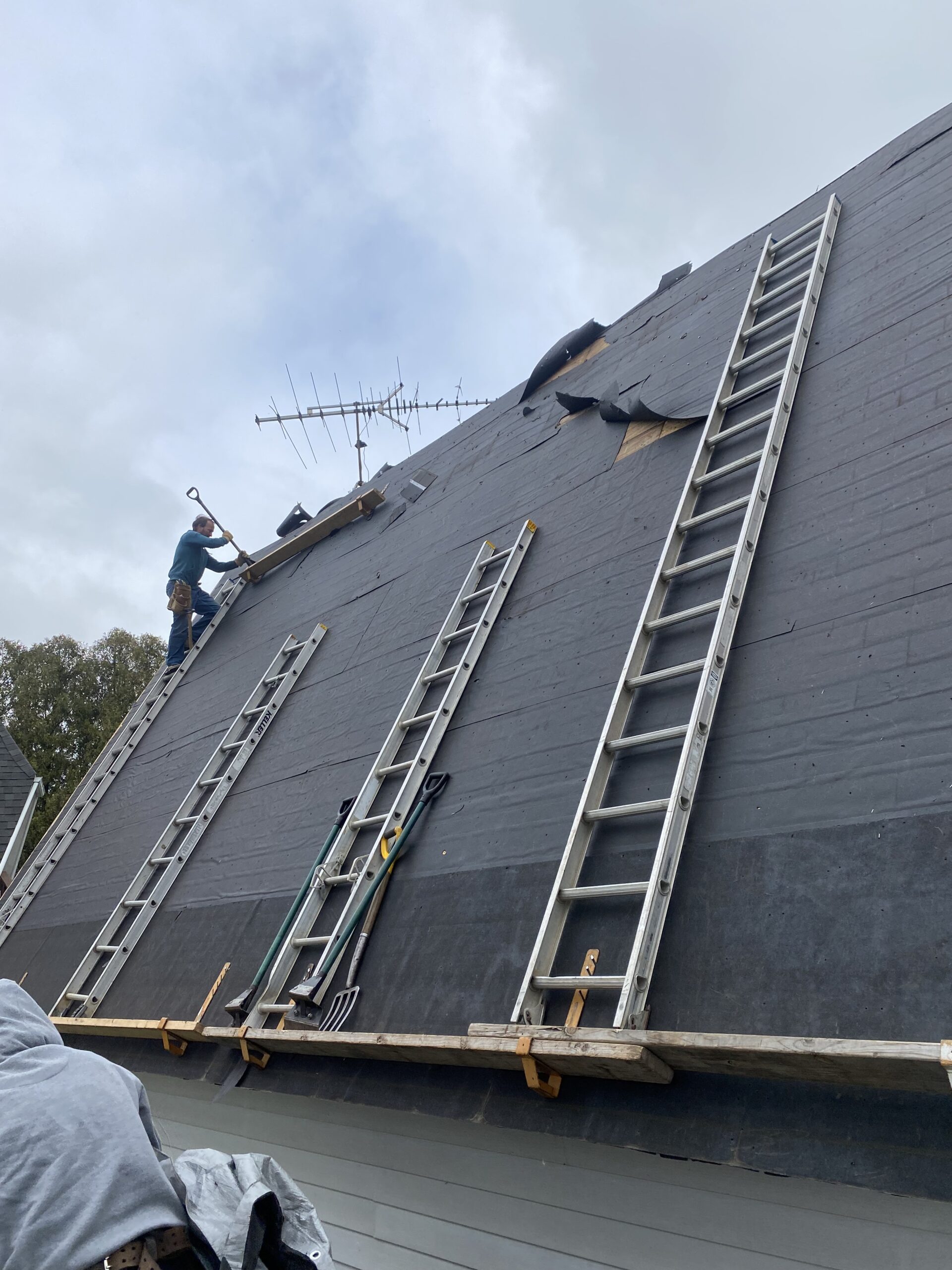 We have a large 2-1/2 story home where parts of the roof are quite steep. All workers were tethered while on the dangerous parts of the roof.